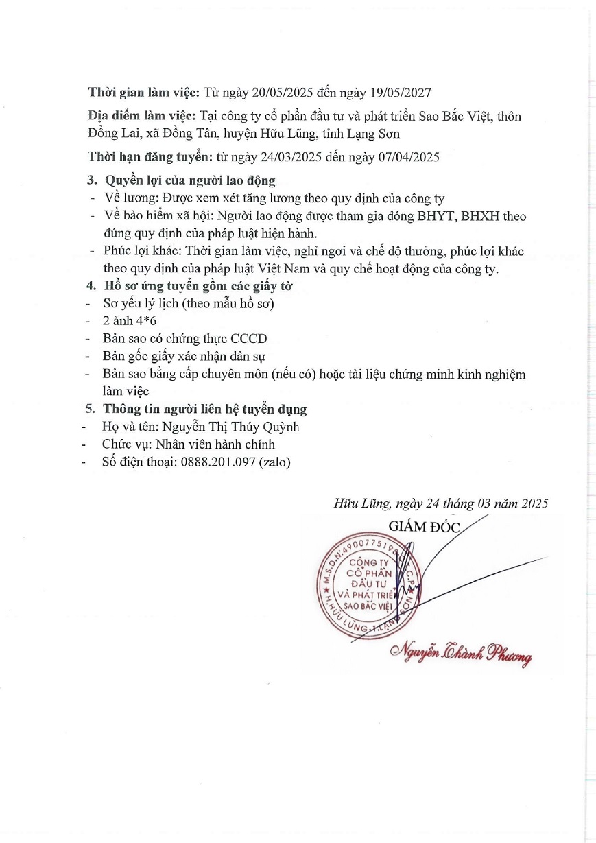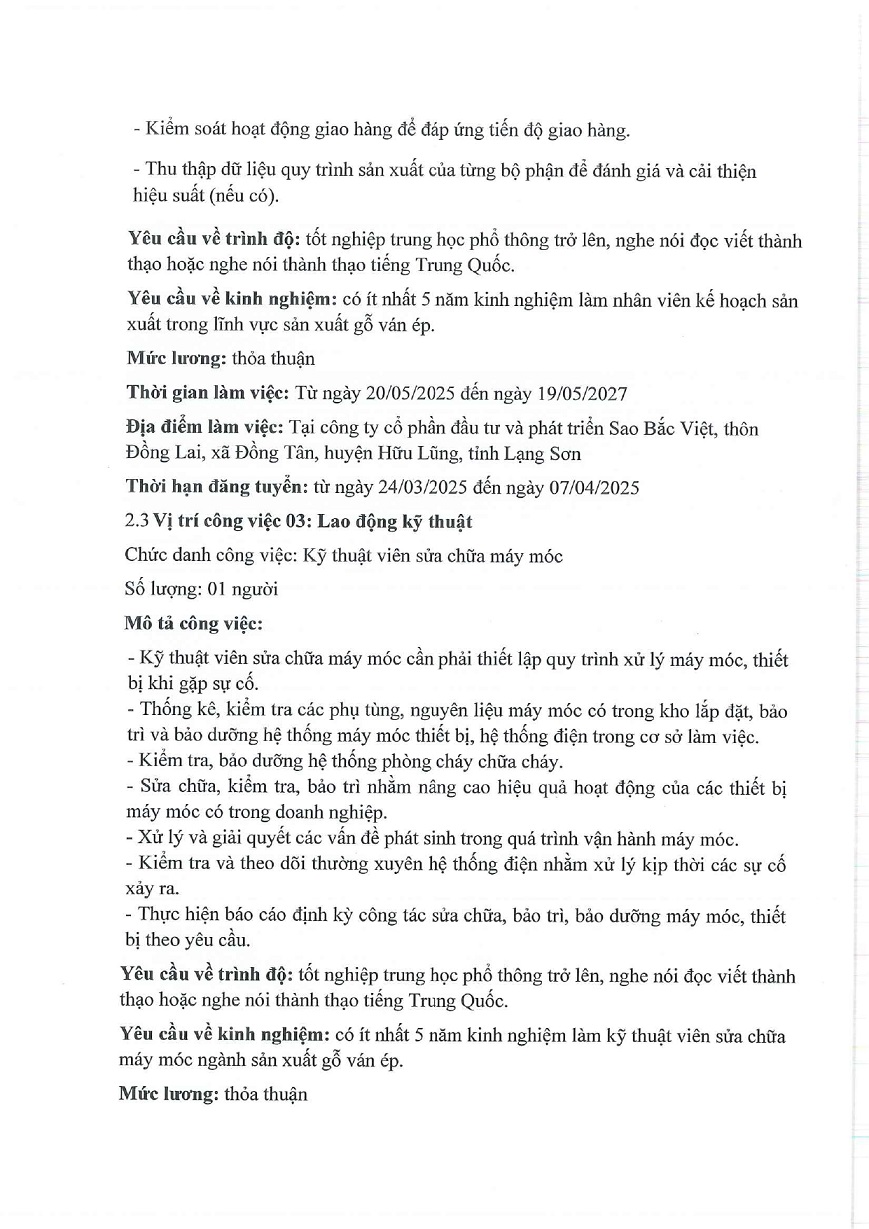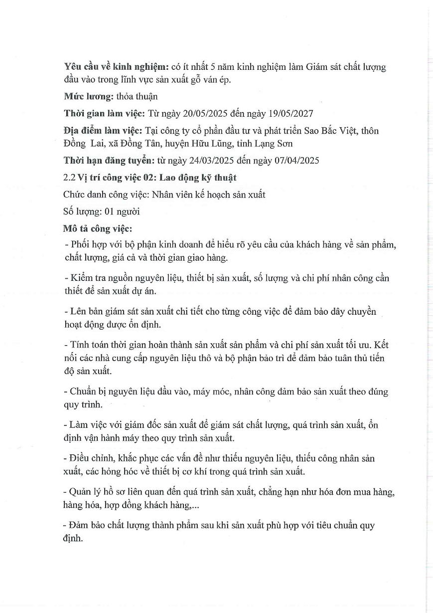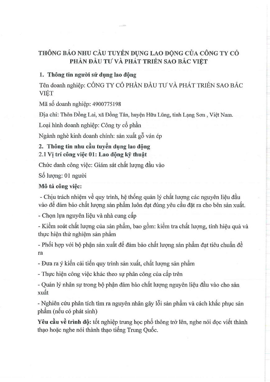 Tuyển dụng, Tuyển dụng trong tỉnh CÔNG TY CỔ PHẦN ĐẦU TƯ VÀ PHÁT TRIỂN SAO BẮC VIỆT – TUYỂN LAO ĐỘNG KỸ THUẬT 26 Th3