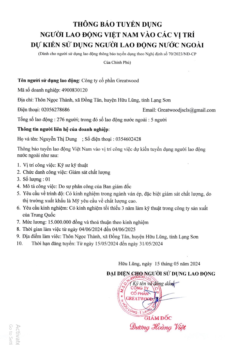 THÔNG BÁO TUYỂN DỤNG – CÔNG TY CỔ PHẦN GREATWOOD