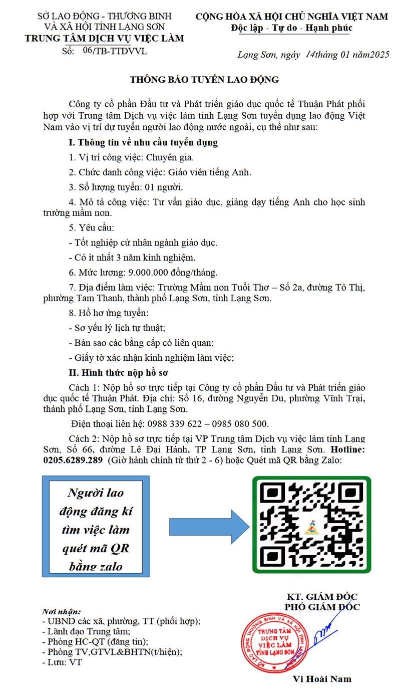 • Zalo Page: Trung tâm dịch vụ việc làm Lạng Sơn
