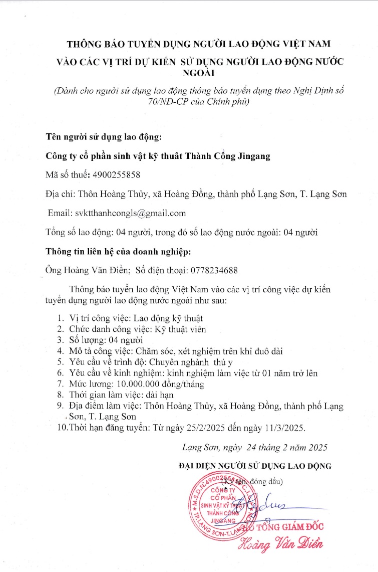 Công ty cp sinh vật kỹ thuật Thành Công Jingang – Tuyển LĐ kỹ thuật