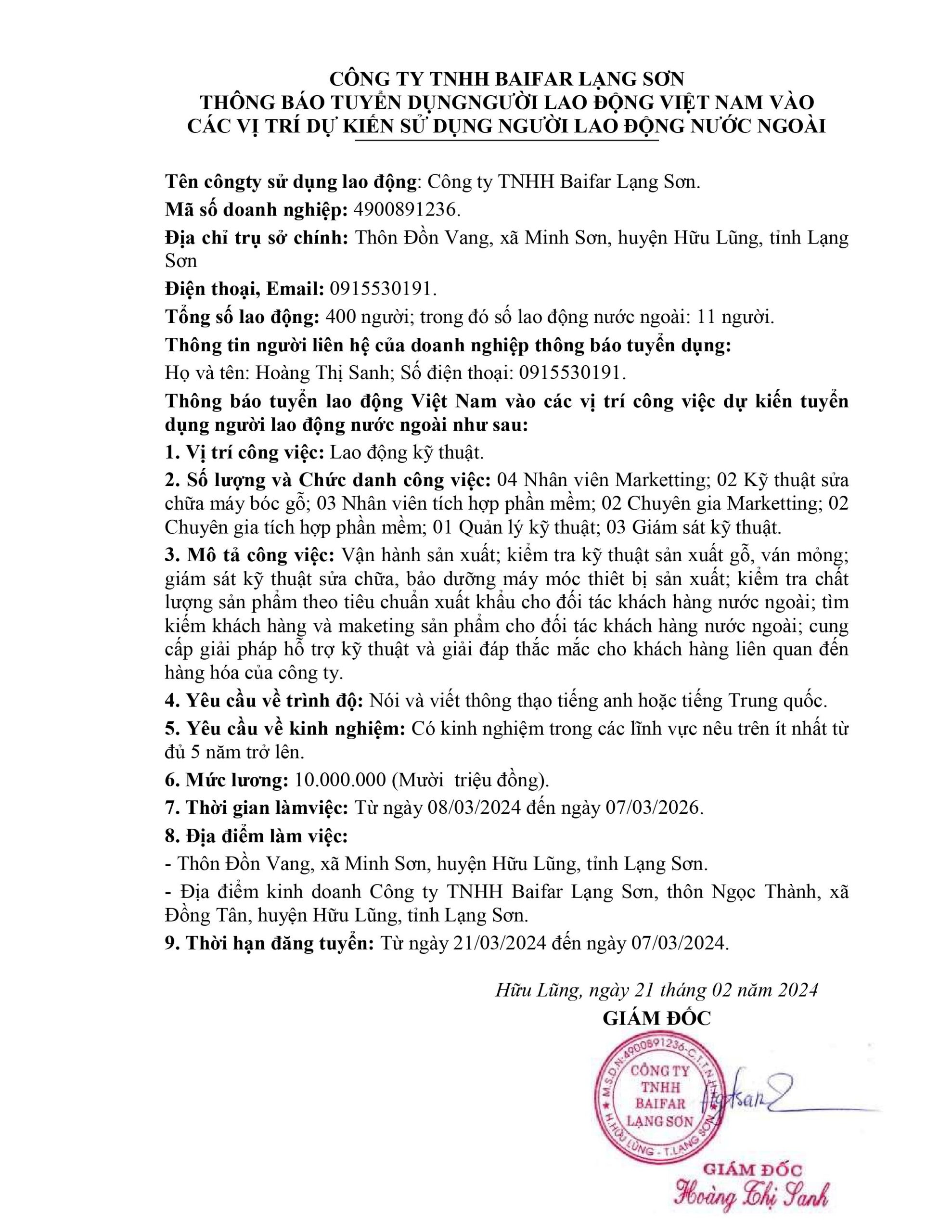 CÔNG TY TNHH BAIFAR LẠNG SƠN – thông báo tuyển lao động