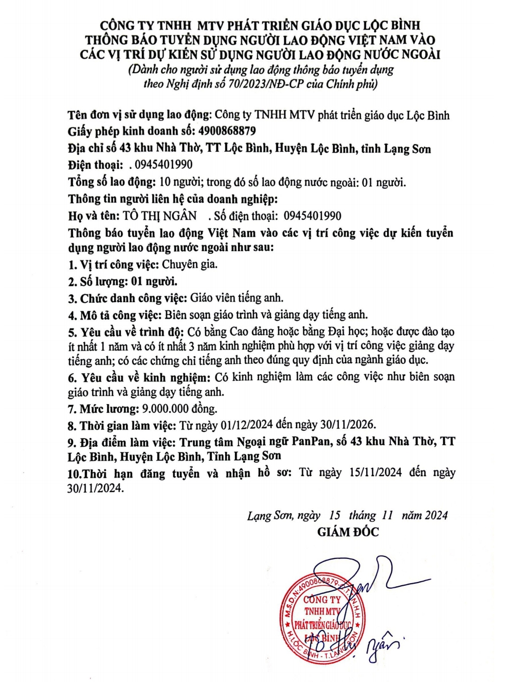 Công ty TNHH MTV phát triển giáo dục Lộc Bình – tuyển lao động