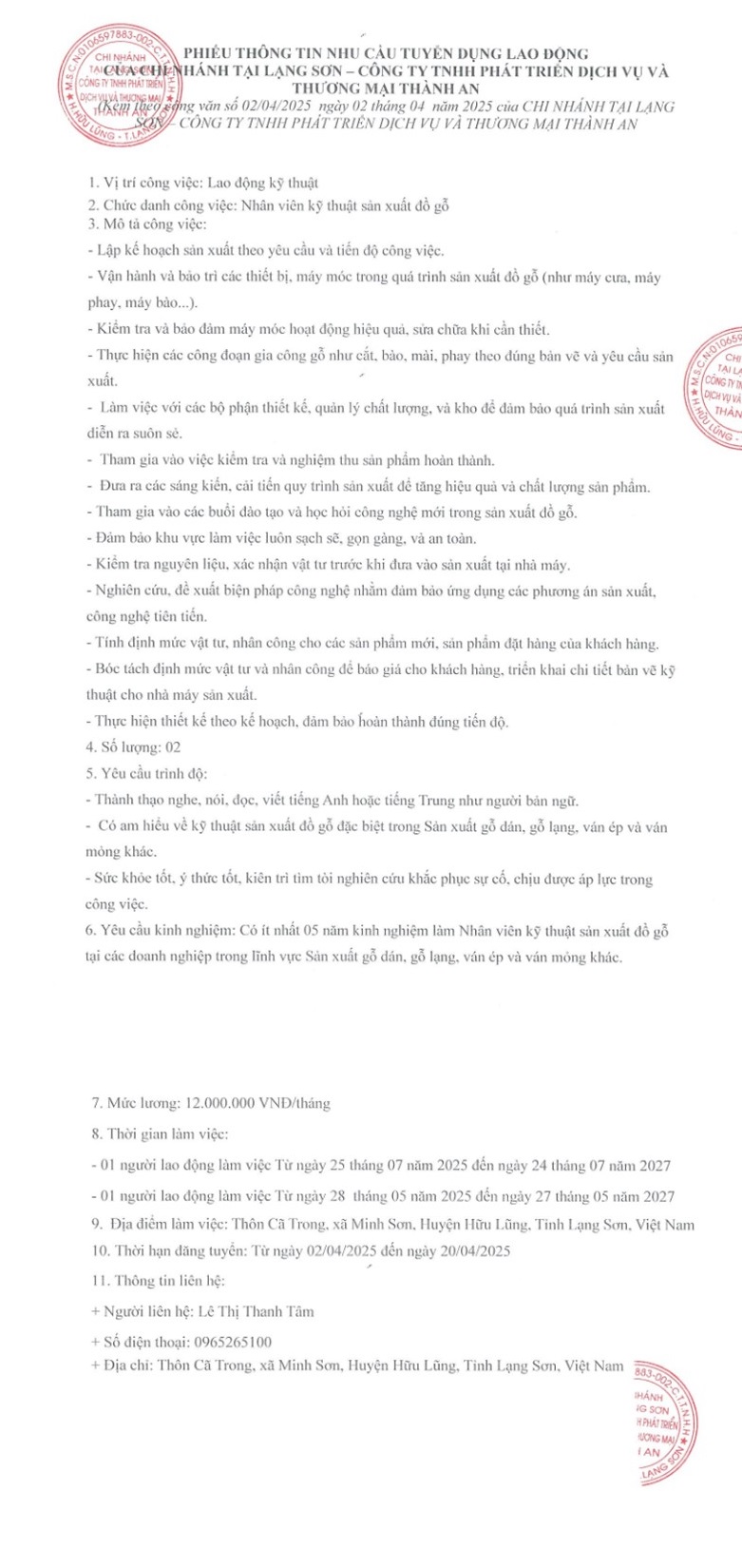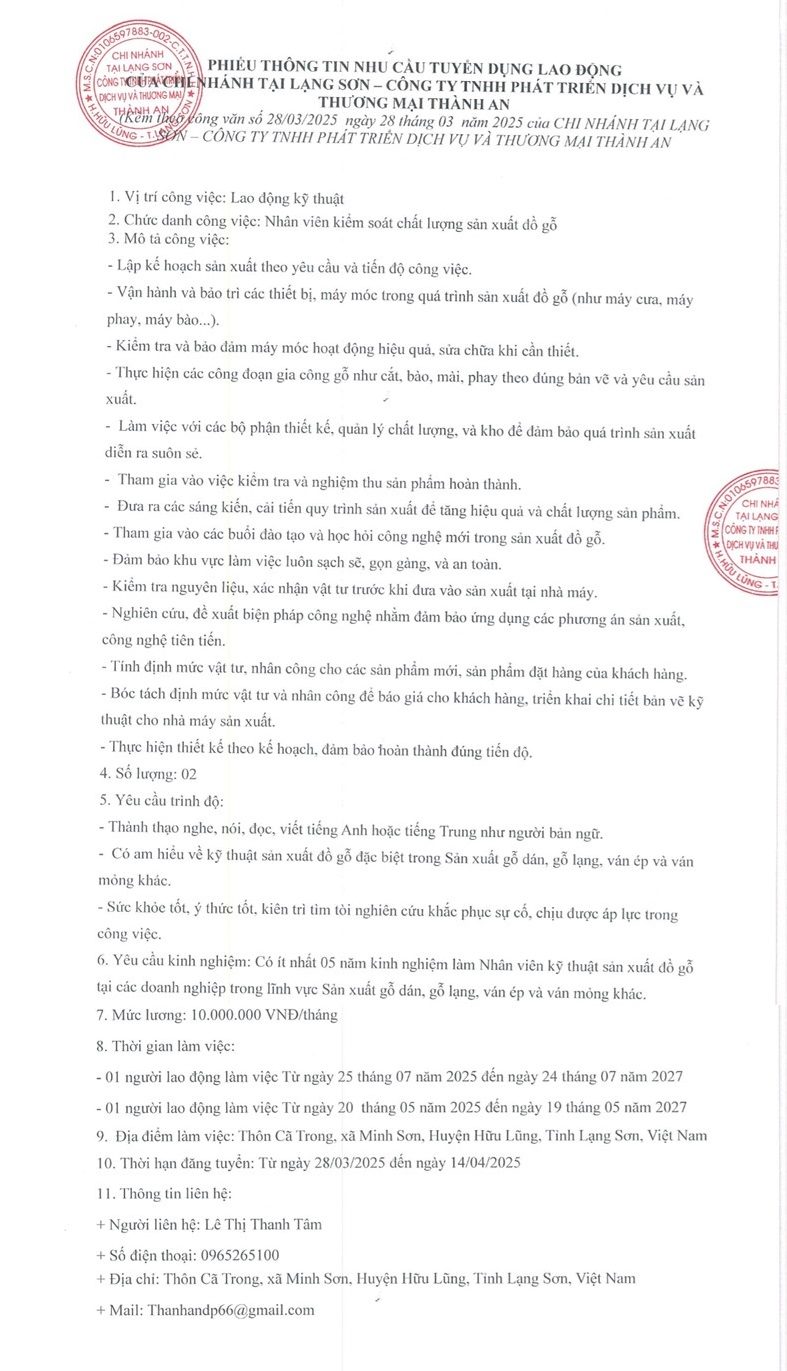 CÔNG TY TNHH PHÁT TRIỂN DỊCH VỤ VÀ THƯƠNG MẠI THÀNH AN – TB TUYỂN LAO ĐỘNG