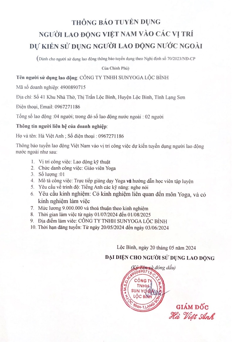CÔNG TY TNHH SUNYOGA LỘC BÌNH – Tuyển giáo viên Yoga
