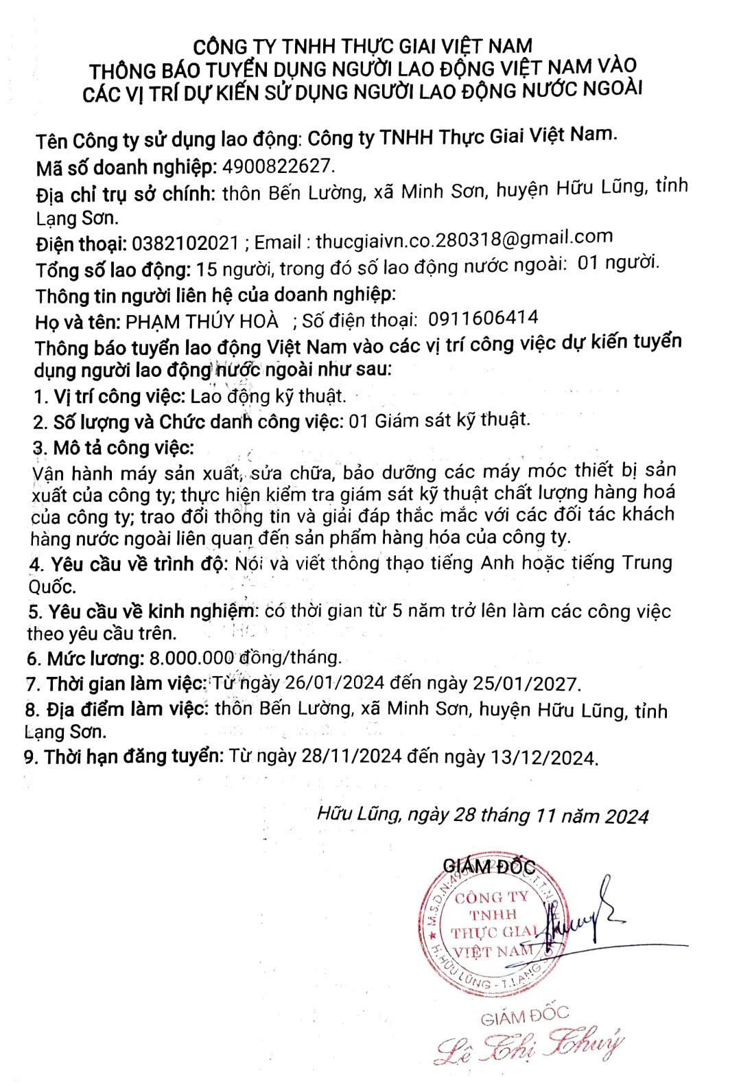 CÔNG TY TNHH THỰC GIAI VIỆT NAM – TUYỂN LAO ĐỘNG KỸ THUẬT
