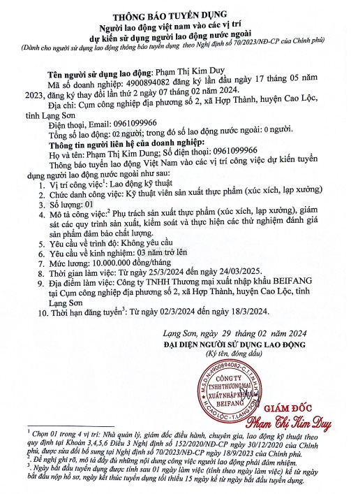 Tuyển dụng, Tuyển dụng trong tỉnh Công ty TNHH Thương mại XNK BEIFANG – tuyển Kỹ thuật viên sản xuất thực phẩm 29 Th2