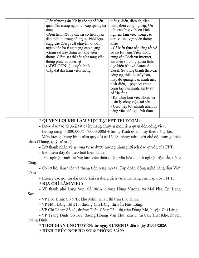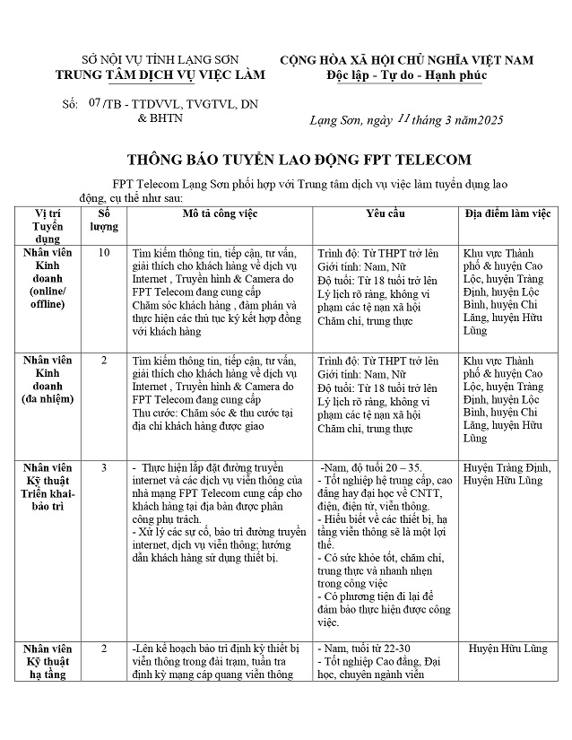 FPT TELECOM – THÔNG BÁO TUYỂN LAO ĐỘNG