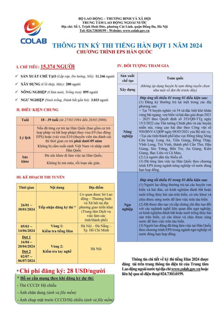 Căn cứ kế hoạch mà Cơ quan phát triển nguồn nhân lực Hàn Quốc đề nghị ngày 29/12/2023, Trung tâm Lao động ngoài nước đã Thông báo tổ chức kỳ thi tiếng Hàn Đợt 1 năm 2024, trong kỳ tuyển chọn lần này, phía Hàn Quốc thông báo tuyển chọn 15.374 người (sản xuất chế tạo: 11.276 người; nông nghiệp 895 người; xây dựng 200 người; ngư nghiệp: 3.033 người). Kỳ thi này đã nhận được sự quan tâm của đông đảo người lao động có nguyện vọng đi làm việc tại Hàn Quốc theo Chương trình EPS, bên cạnh đó cũng nhiều vấn đề người lao động chưa hiểu rõ, có ý kiến thắc mắc, Trung tâm Lao động ngoài nước tổng hợp, trả lời một số vấn đề được nhiều người lao động quan tâm như sau: