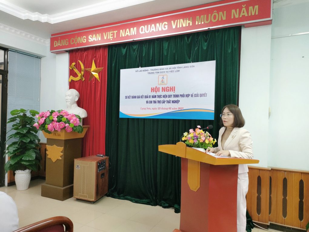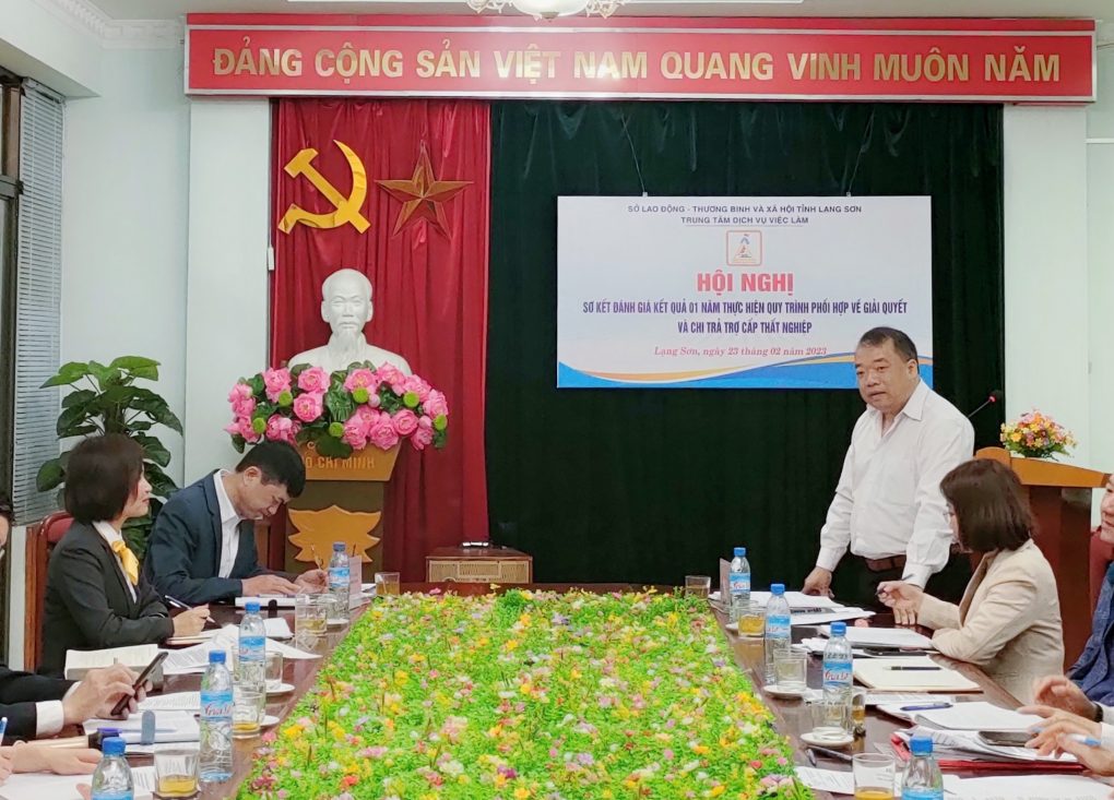 Nhằm nâng cao hiệu quả trong việc thực hiện Quy trình phối hợp giữa Sở Lao động-Thương binh và Xã hội tỉnh Lạng Sơn, Bảo hiểm xã hội tỉnh Lạng Sơn và Bưu điện tỉnh Lạng Sơn về việc thực hiện giải quyết và chi trả trợ cấp thất nghiệp cho người lao động. Ngày 23/02/2023, Trung tâm Dịch vụ việc làm Lạng Sơn đã tổ chức Hội nghị sơ kết đánh giá một năm thực hiện Quy trình phối hợp giải quyết và chi trả trợ cấp thất nghiệp cho người lao động.