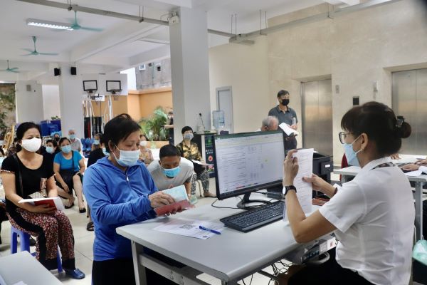 Người dân đến giao dịch giải quyết chế độ về bảo hiểm xã hội tại trường THPT Ngô Sỹ Liên (quận Hoàn Kiếm). Ảnh: Trần Thảo. |