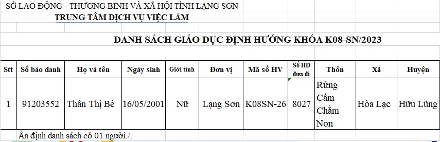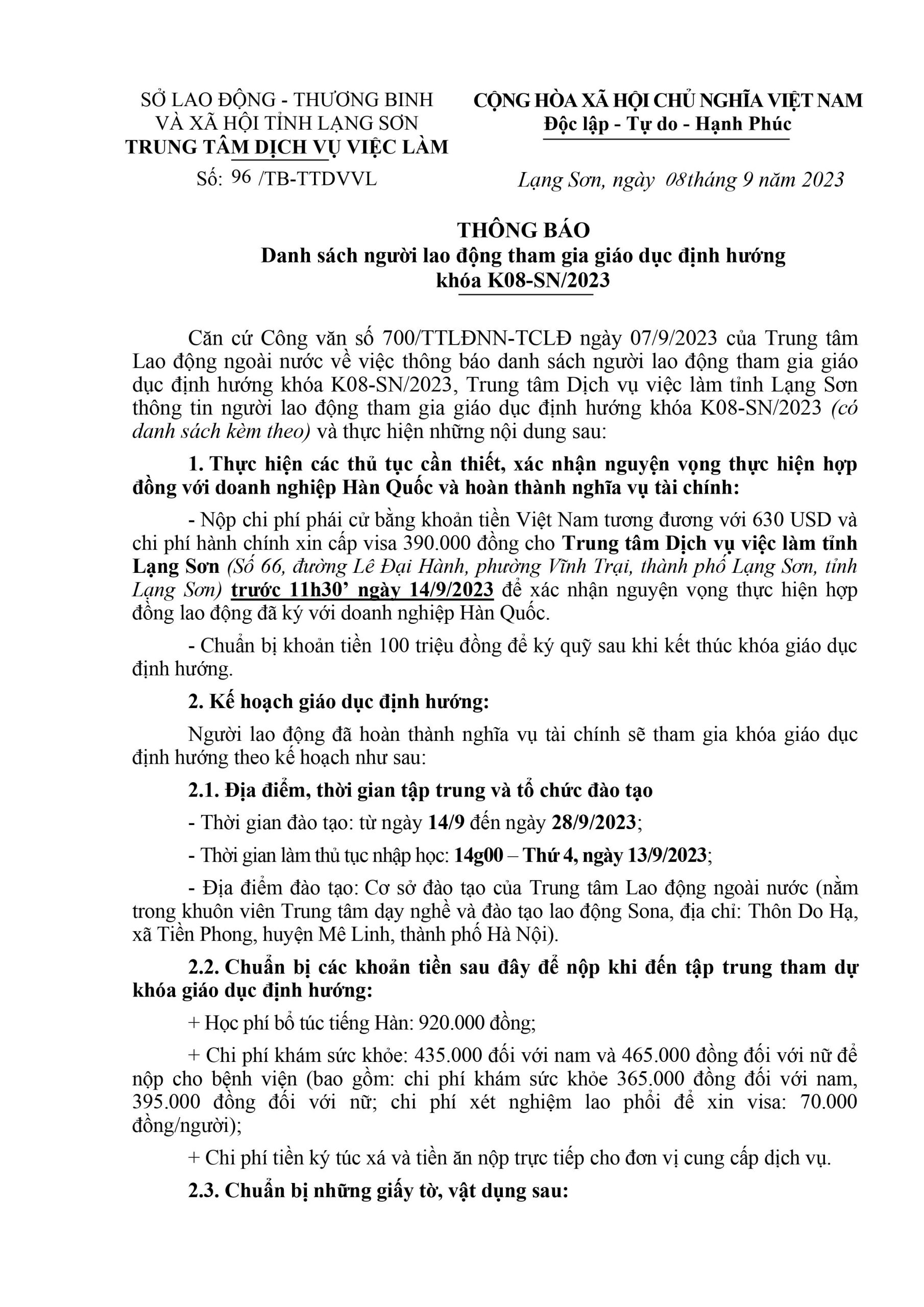 TIN TỨC, Xuất Khẩu Lao Động THÔNG BÁO Danh sách người lao động tham gia giáo dục định hướng khóa K08-SN/2023 08 Th9