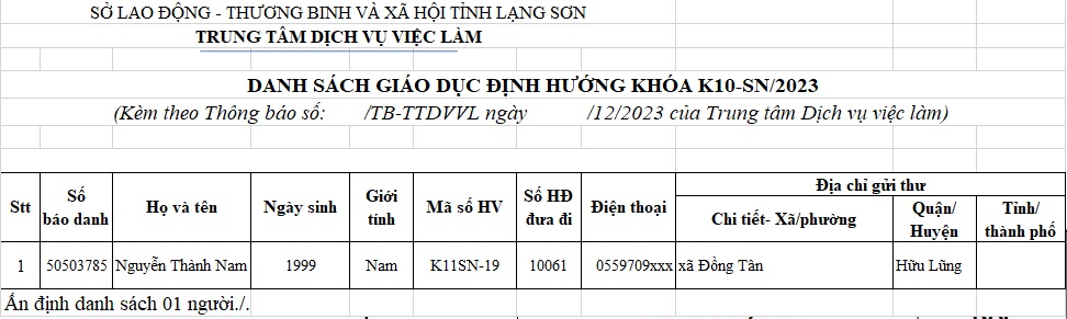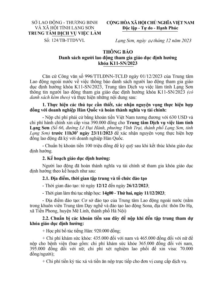 TIN TỨC, Xuất Khẩu Lao Động Thông báo Danh sách người lao động tham gia giáo dục định hướng khóa K11-SN/2023 06 Th12