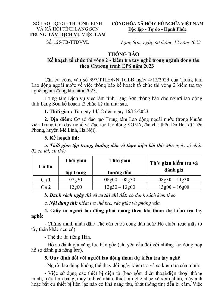 TIN TỨC, Xuất Khẩu Lao Động Thông báo Kế hoạch tổ chức thi vòng 2 – kiểm tra tay nghề trong ngành đóng tàu theo Chương trình EPS năm 2023 06 Th12