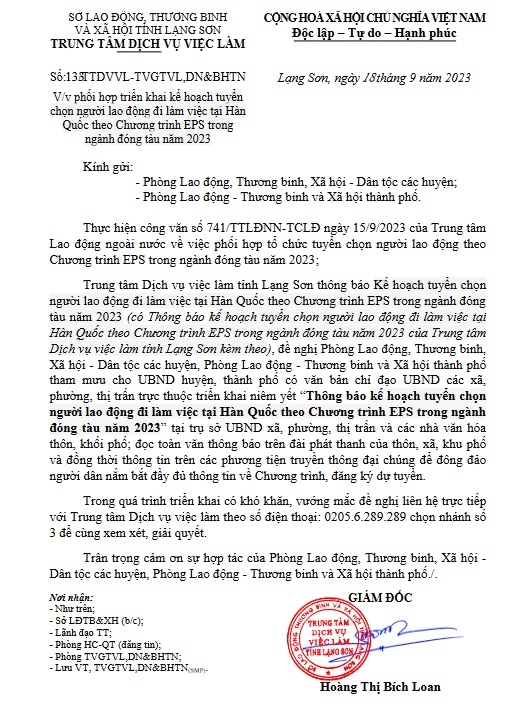 Hoạt động của Trung tâm, TIN TỨC, Xuất Khẩu Lao Động KẾ HOẠCH TUYỂN CHỌN NGƯỜI LAO ĐỘNG ĐI LÀM VIỆC TẠI HÀN QUỐC THEO CHƯƠNG TRÌNH EPS TRONG NGÀNH ĐÓNG TÀU NĂM 2023 19 Th9 09.2023. Thong bao ke hoach tuyển chọn người lao động đi làm việc tại Hàn Quốc theo chương trình EPS trong ngành đóng tàu năm 2023