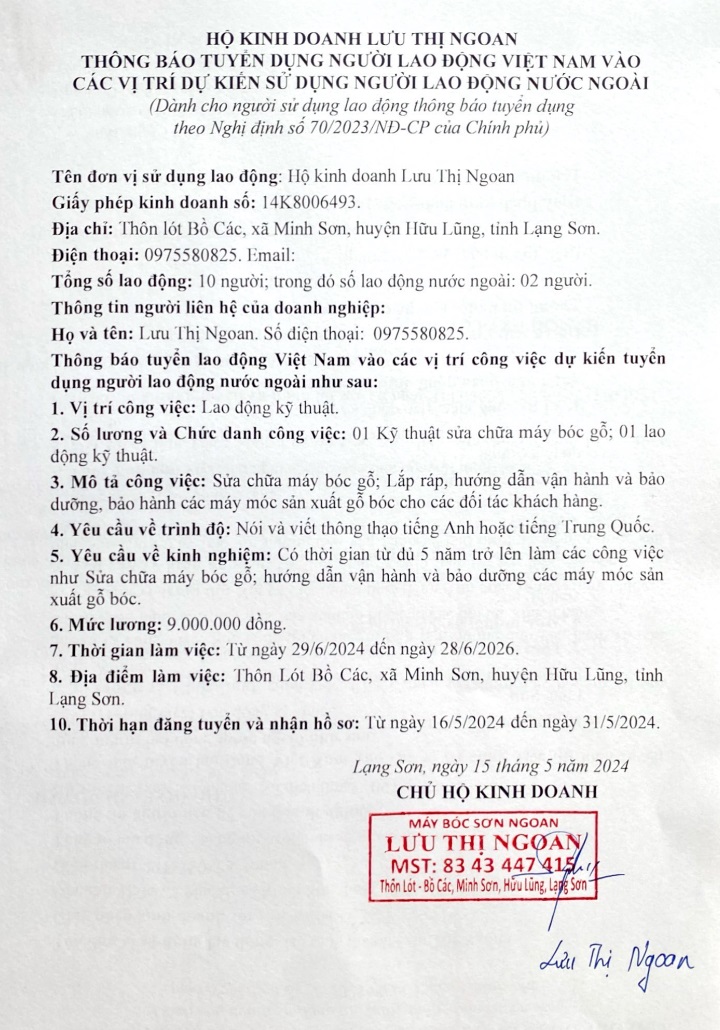 Thông báo tuyển dụng Lao động kỹ thuật sửa chữa máy bóc gỗ