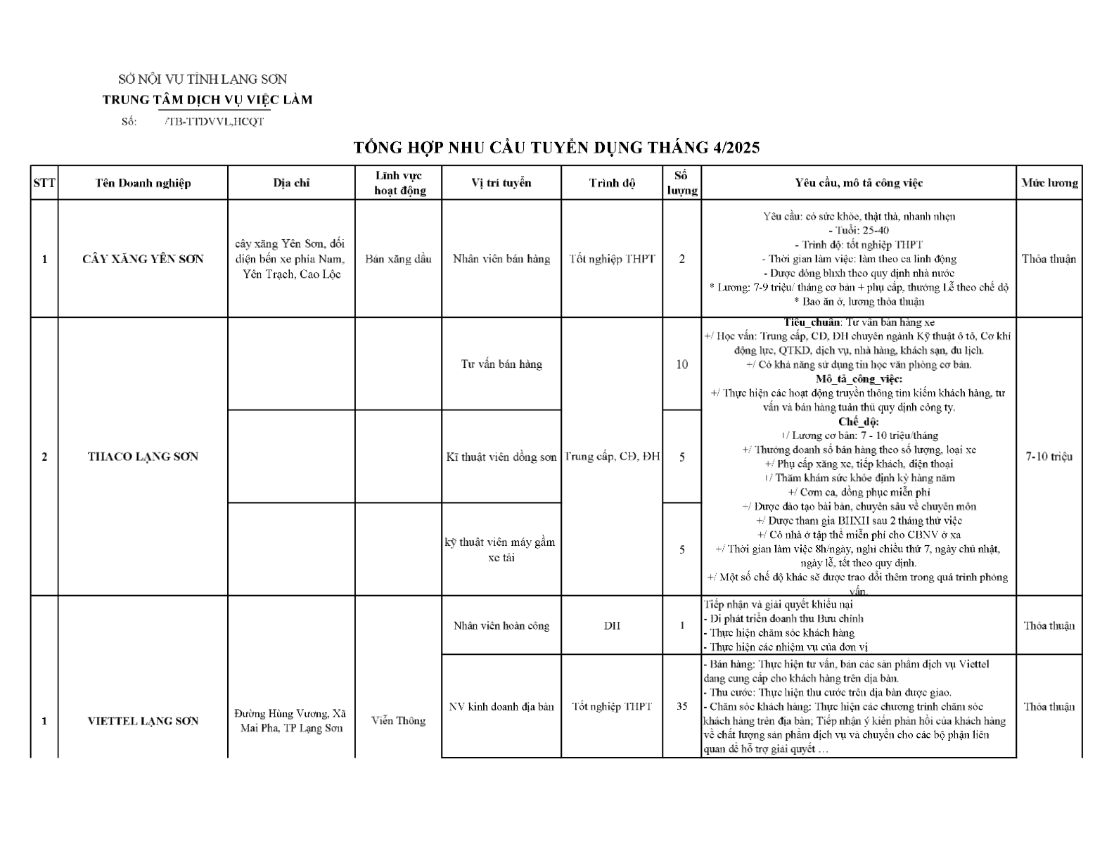 TRUNG TÂM DỊCH VỤ VIỆC LÀM TỈNH LẠNG SƠN