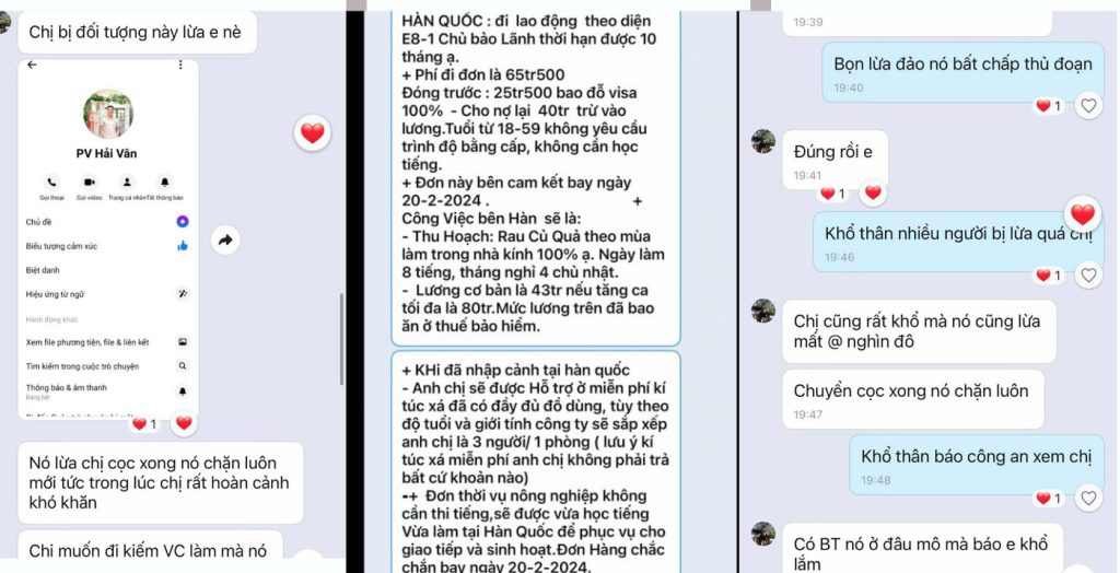 Tuy nhiên, khi chị cùng chồng lên Facebook tìm hiểu thì thấy nhiều nơi nhận làm visa thời vụ sang Hàn Quốc với chi phí hợp lý. Hình ảnh thể hiện họ đã đưa hàng trăm lao động sang Hàn Quốc làm việc thời vụ thu hoạch nông sản, cuộc sống tốt, thu nhập cao. Tưởng thật, chị chuyển 20 triệu đồng đặt cọc nhưng sau đó đã bị chặn mọi thông tin liên lạc.