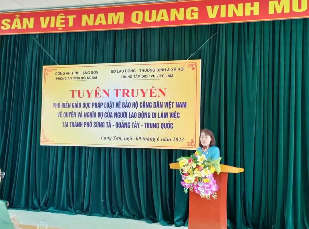 Ngày 09/06/2023, Trung tâm Dịch vụ việc làm tỉnh Lạng Sơn phối hợp với Phòng An ninh đối ngoại, Công an tỉnh Lạng Sơn và Công ty TNHH Dịch vụ thương mại tổng hợp Ngọc Quỳnh tổ chức tuyên truyền phổ biến giáo dục pháp luật về bảo hộ công dân Việt Nam, về quyền và nghĩa vụ của người lao động đi làm việc tại thành phố Sùng tả, Quảng tây, Trung quốc…