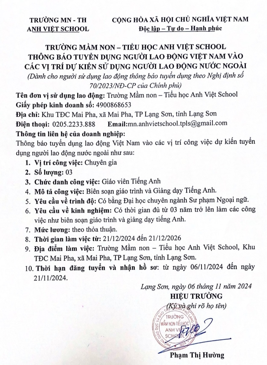 Tuyển dụng, Tuyển dụng trong tỉnh TRƯỜNG MẦM NON – TIỂU HỌC ANH VIỆT SCHOOL – tuyển dụng Giáo viên Tiếng Anh 07 Th11